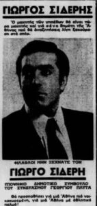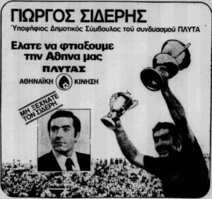 Στην ίδια εφημερίδα, πέντε (5) μέρες αργότερα βρίσκουμε διαφημιστική καταχώρηση του συνυποψήφιου με τον συνδυασμό «Αθηναϊκή κίνηση – ΠΛΥΤΑΣ» και πρώην «κανονιέρη» του Ολυμπιακού Γιώργου Σιδέρη. Και αυτός ζητούσε την ψήφο των Αθηναίων δημοτών.
