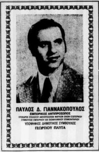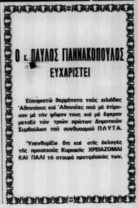 Όπως βλέπουμε στην παραπάνω διαφημιστική καταχώρηση που δημοσιεύτηκε στις 3 Οκτωβρίου του 1978 στην εφημερίδα «Αθλητική Ηχώ», ο Παύλος Γιαννακόπουλος κατέβαινε υποψήφιος δημοτικός σύμβουλος με τον συνδυασμό του Γεώργιου Πλυτά.