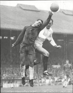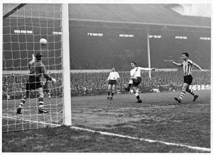 Στη φωτογραφία ο Graham Leggat μαζεύει τη μπάλα μετά το τρίτο προσωπικό του γκολ από τα τέσσερα συνολικά, υπό το βλέμμα του τερματοφύλακα της Ίπσουϊτς Roy Bailey, ο οποίος είδες την μπάλα να καταλήγει στα δίχτυα του 10 φορές!